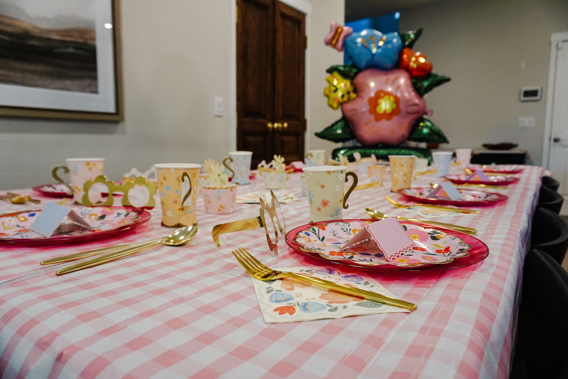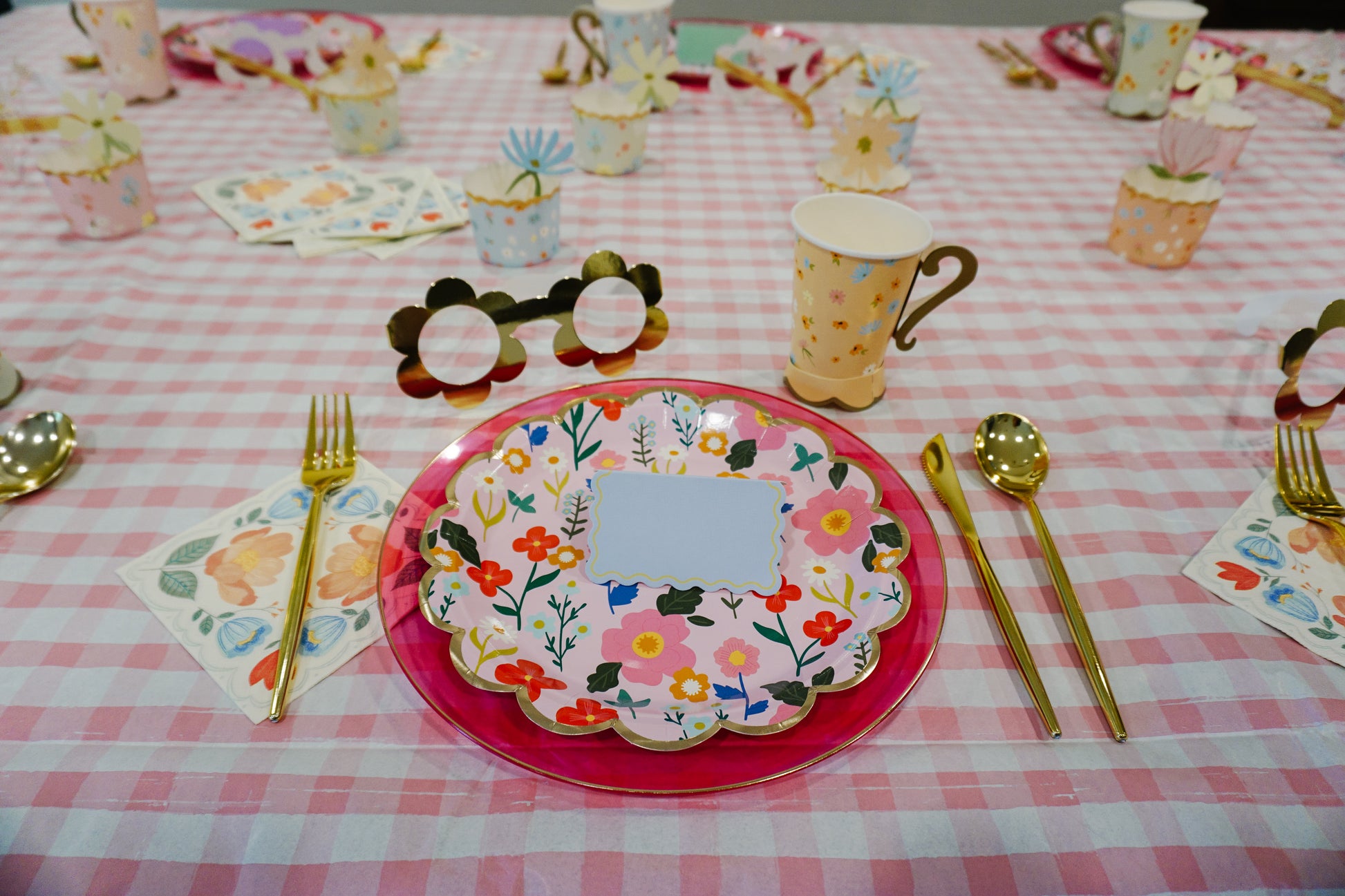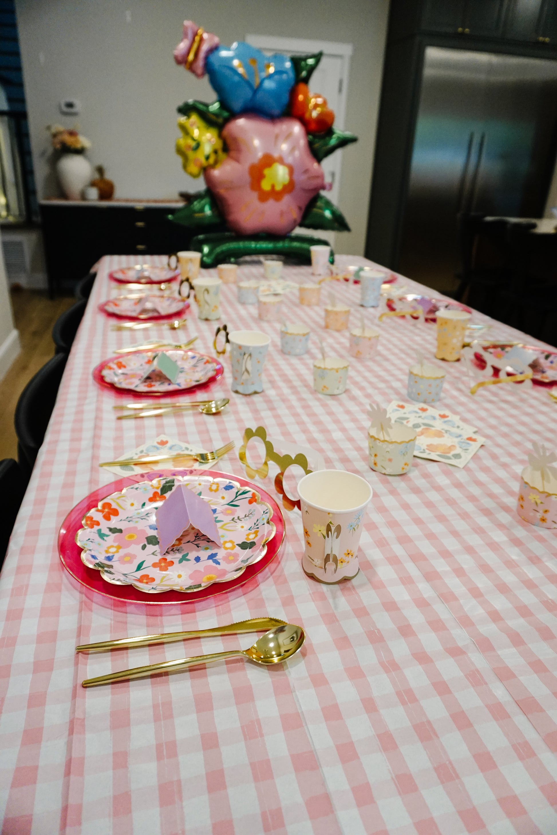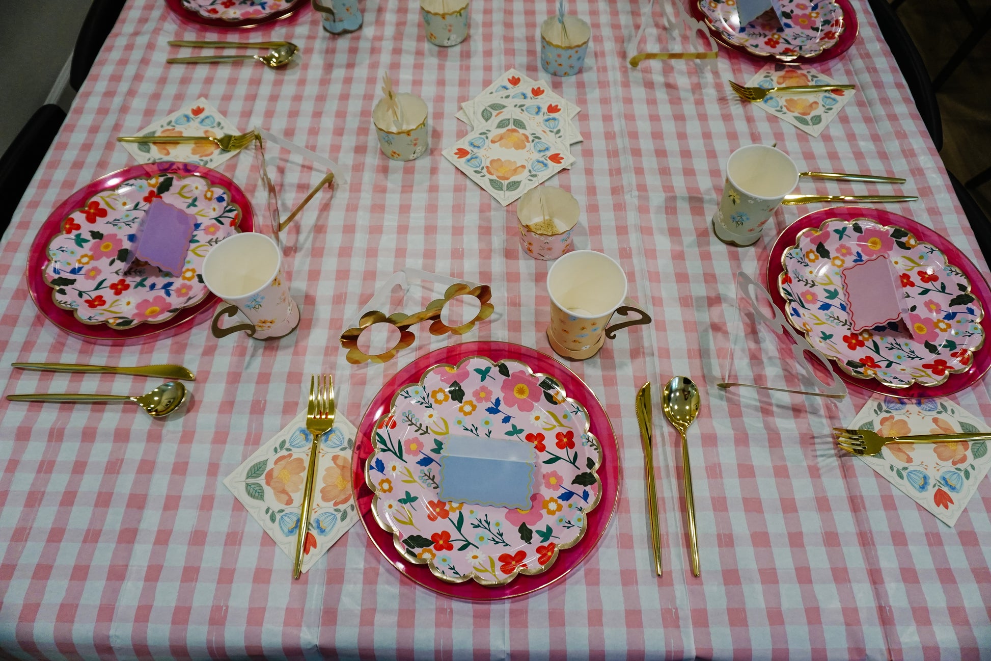 - 1 pink gingham paper tablecloth (8.5ft x 4.5ft)